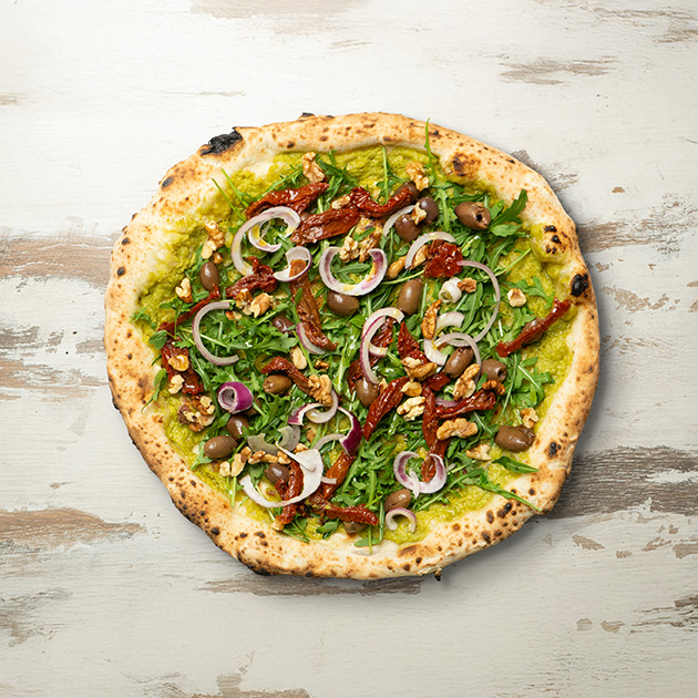Crema di zucchine, pomodoro secco, olive nere, rucola, cipolla, noci.