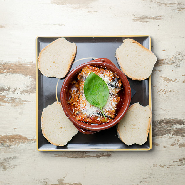 Ragù di pomodoro, melanzane fritte, mozzarella, parmigiano.