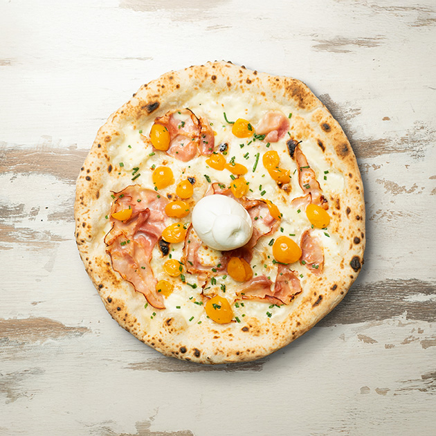 Fior di latte, prosciutto cotto arrosto, pomodorino giallo semidry, burrata e erba cipollina.