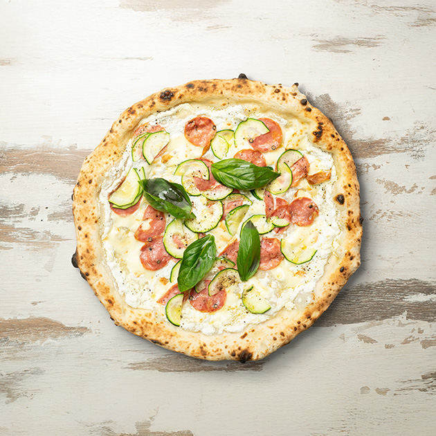 Provola, ricotta di bufala, salame, zucchine fresche, pepe.