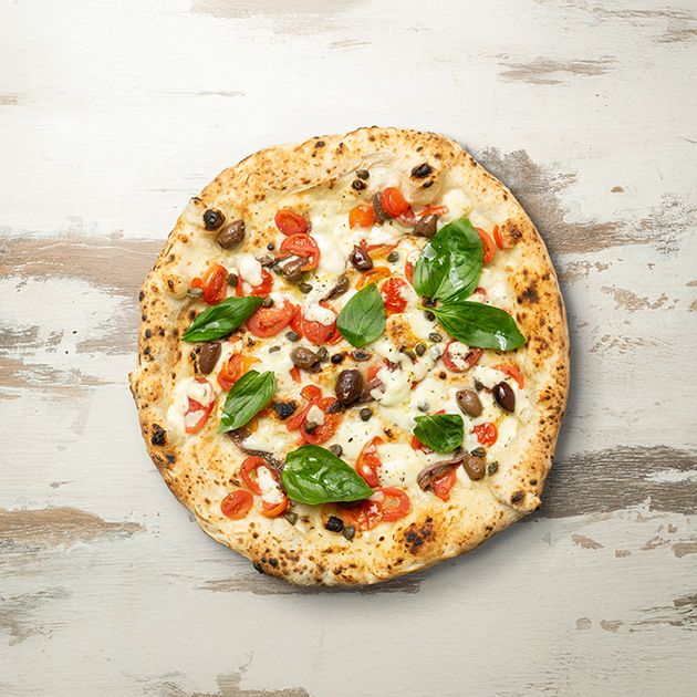 Fior di latte, pomodorini datterini, capperi, acciughe, olive nere, origano.