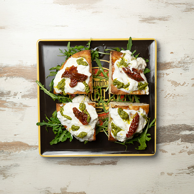 Pesto, stracciata, pomodoro secco.