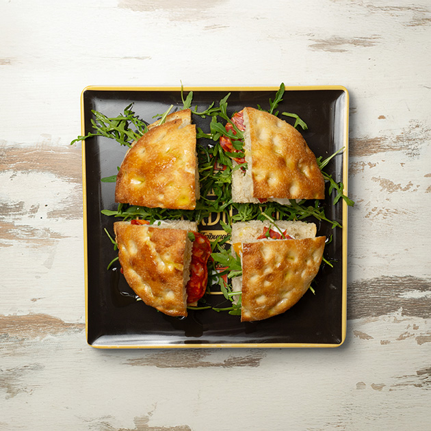 Stracciata, spianata piccante, rucola, pomodorino giallo semidry.
